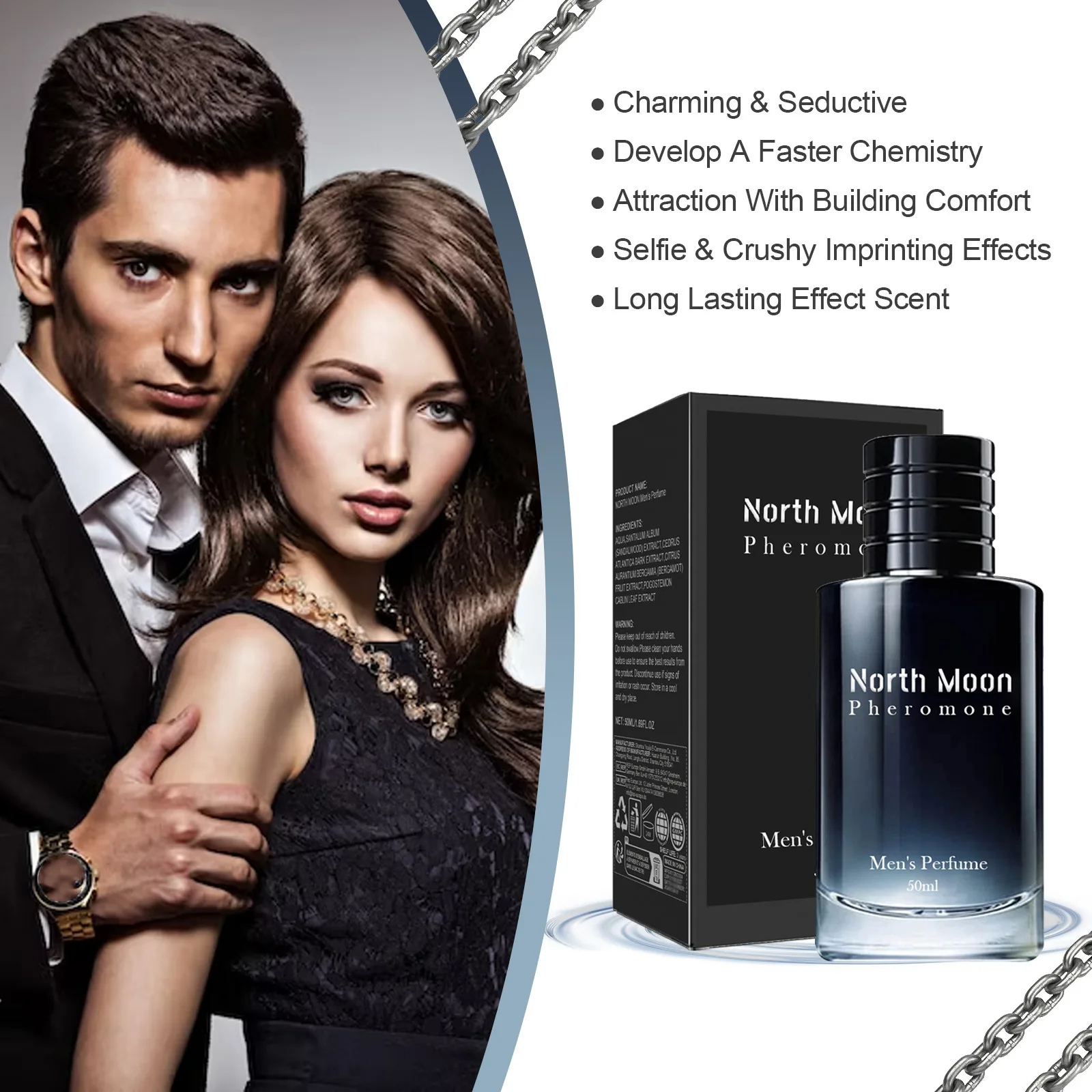 North Moon is a fresh, charming perfume for men featuring sandalwood and subtle pheromones. Designed to be long-lasting and alluring, it’s ideal for casual days or flirtatious nights.